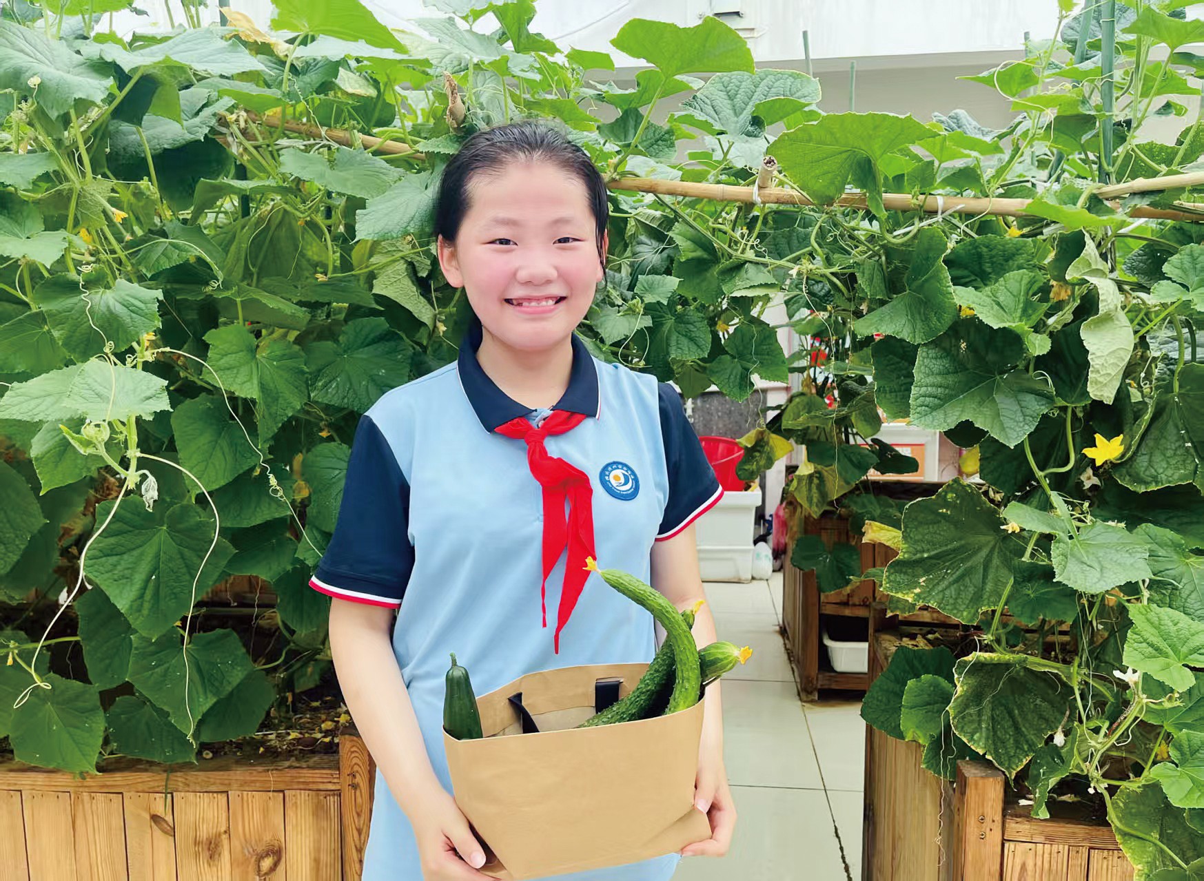 “开心农场”作为劳动教育基础场域,成为打破学科壁垒、实现跨学科学习的鲜活课堂。语文课在这里能找到鲜活的素材,“观察日记”任务可以在田间完成,豆苗攀爬、雏鸡破壳的细节描写跃然纸上。科学课的探究变得触手可及。生物老师带着同学们对比不同光照、水分条件下植物的生长差异,观察昆虫与植物的关系。数学课在这里格外实用,计算产量、估算成本收益、设计包装尺寸、规划滴灌用水———抽象概念在解决实际问题中生动落地。